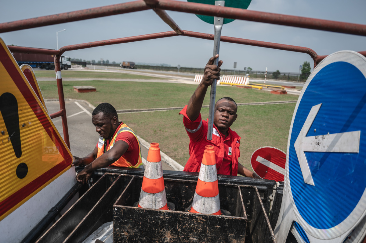 Oficiais de patrulha rodoviária organizam equipamentos em um posto de pedágio na Rodovia Nacional no 1 da República do Congo, em 31 de julho. A rodovia de 536 quil?metros, construída pela China State Construction Engineering Corporation, liga a capital, Brazzaville, ao porto atlantico de Pointe-Noire. (Wang Guansen/Xinhua)