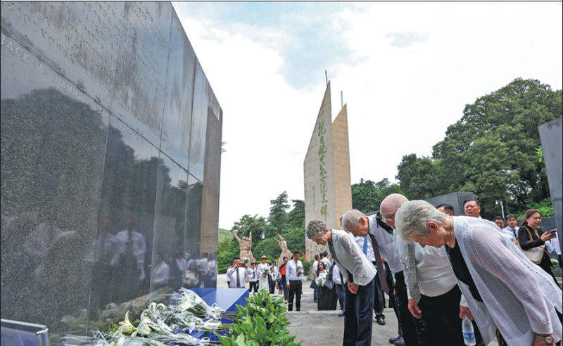 Uma delega??o dos Flying Tigers estadunidenses presta homenagem aos mártires aviadores da Guerra de Resistência contra a Agress?o Japonesa em Nanjing, na província chinesa de Jiangsu, na ter?a-feira. No mesmo dia, o sal?o memorial anunciou a adi??o do nome de Jack Hammel, um piloto membro dos Flying Tigers, ao monumento. (YANG BO/CHINA NEWS SERVICE)