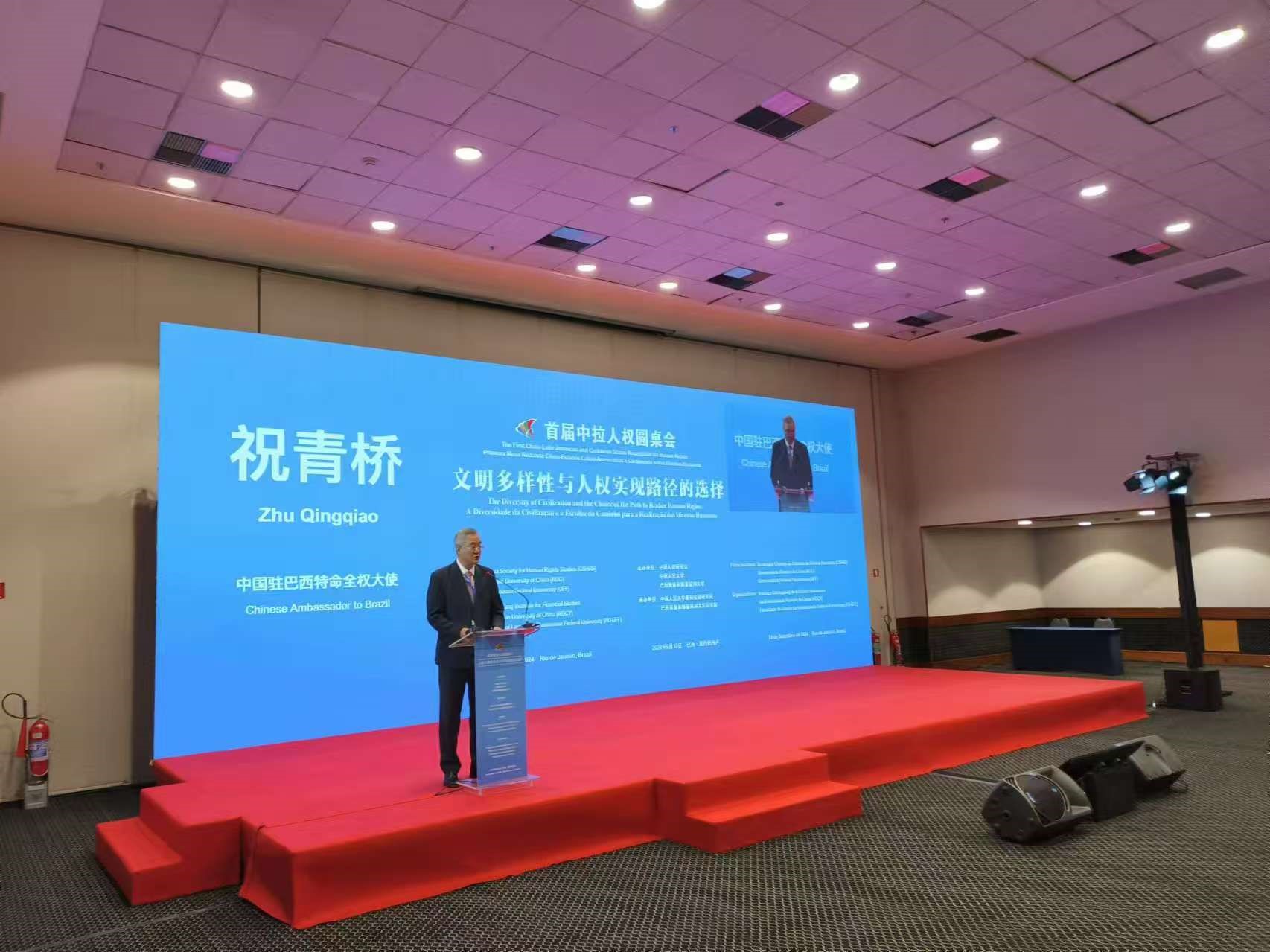 Zhu Qingqiao, Embaixador da China no Brasil, disse em seu discurso que, já no início do novo século, os povos latino-americanos fizeram progressos significativos na manuten??o da estabilidade, na revitaliza??o da economia, no desenvolvimento e bem-estar social e na uni?o para o auto fortalecimento, dando contribui??es positivas para o desenvolvimento da causa global dos direitos humanos.