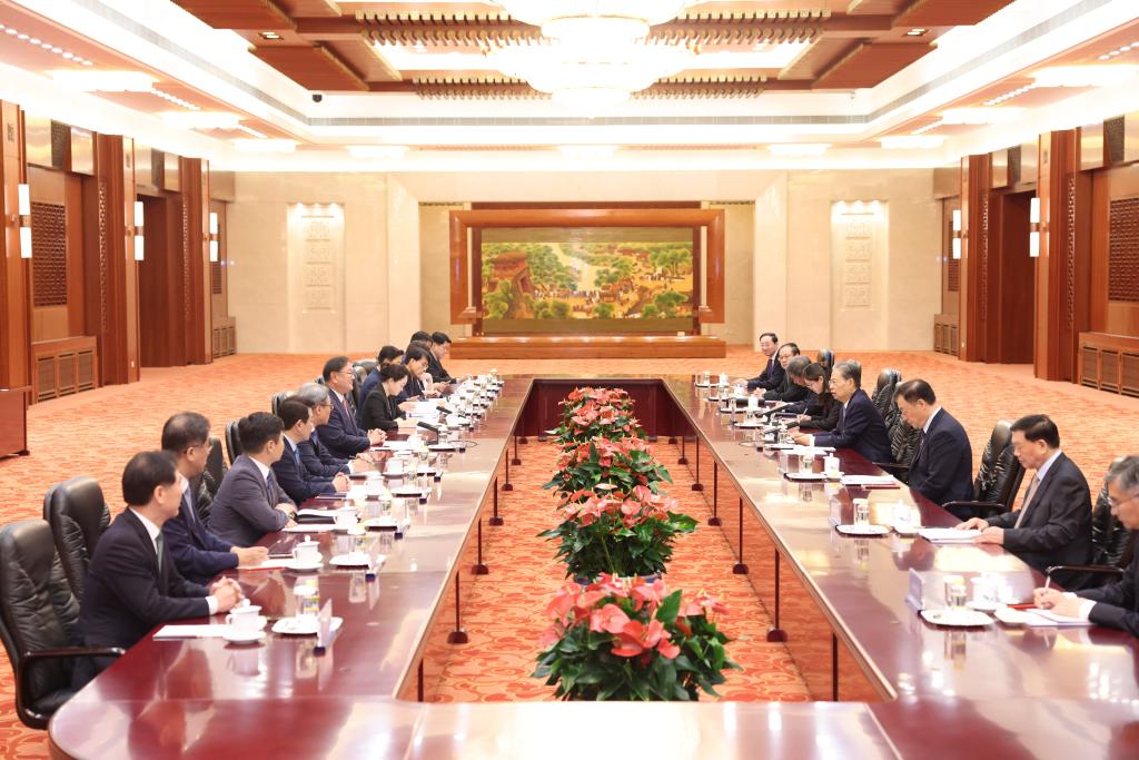 O mais alto legislador da China Zhao Leji reuniu-se nesta quinta-feira, em Beijing, com uma delega??o liderada por Kim Tae-nyeon, presidente da Uni?o de Parlamentares República da Coreia (RDC)-China.