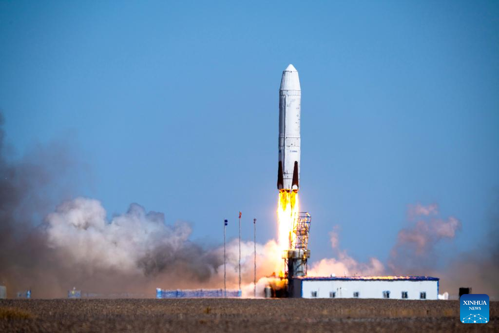 Foguete reutilizável Nebula-1, desenvolvido pela empresa privada de foguetes chinesa Deep Blue Aerospace, decolando durante um teste de voo de recupera??o vertical de alta altitude na Regi?o Aut?noma da Mongólia Interior, no norte da China, em 22 de setembro de 2024. (Deep Blue Aerospace/Xinhua)