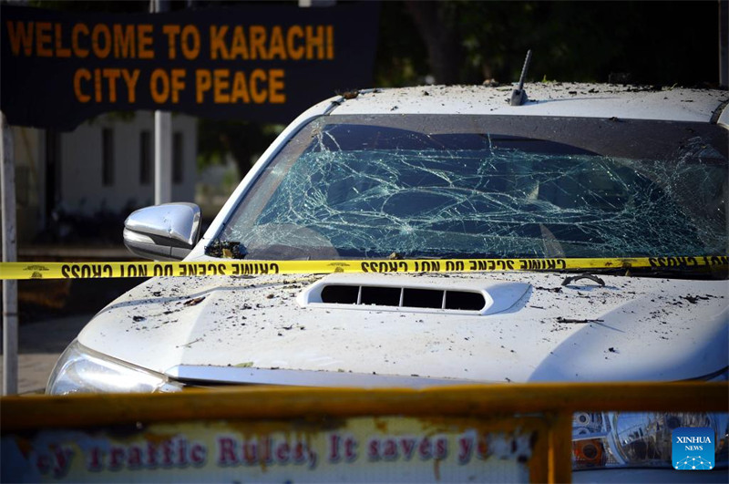 Um carro destruído no local de um ataque terrorista perto do Aeroporto Internacional de Jinnah, em Karachi, capital da província de Sindh, no sul do Paquist?o, em 7 de outubro de 2024. [Foto/Xinhua]