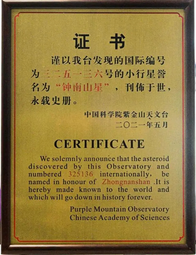 "Anunciamos solenemente que o asteroide descoberto por este Observatório e numerado 325136 internacionalmente, será nomeado em homenagem a Zhong Nanshan", refere o certificado emitido pelo Observatório da Montanha Púrpura da Academia Chinesa de Ciências em Nanjing, na província de Jiangsu.
