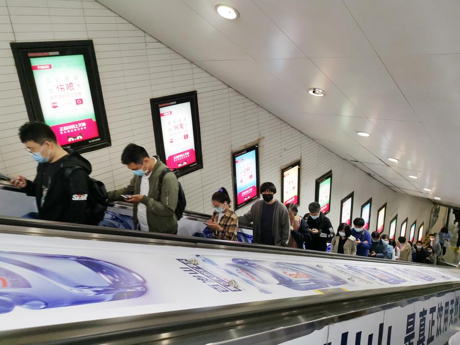 Pessoas usam escada rolante numa esta??o de metr? em Beijing, capital da China, em 11 de maio de 2021. (Foto: Ju Huanzong/Xinhua)