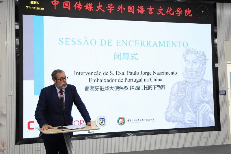 O embaixador português na China, Paulo Jorge Nascimento, profere um discurso na sess?o de encerramento do simpósio em comemora??o do 500o aniversário do poeta português Luís Vaz de Cam?es, realizada na Universidade de Comunica??o da China, no dia 18 de outubro (Foto: Universidade de Comunica??o da China)