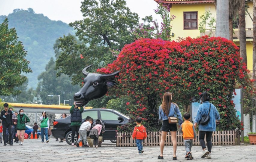 Visitantes admiram buganvílias em Xiamen, na província de Fujian, em mar?o de 2023. A planta, nativa de países da América do Sul, incluindo o Brasil, foi designada como flor da cidade de Xiamen em 1986. Foto: China Daily