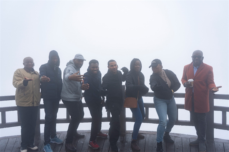 Jornalistas estrangeiros posam para uma foto em um pico da área cênica da Montanha Haishang Yuntai, em Lianyungang, província de Jiangsu, leste da China, em 22 de outubro de 2024. (Chang Sha, Diário do Povo Online)