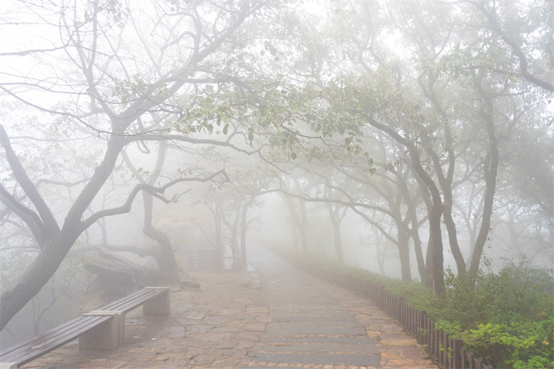 Trilha em meio à forte neblina na área cênica da Montanha Haishang Yuntai, em Lianyungang, província de Jiangsu, leste da China. (Chang Sha, Diário do Povo Online)
