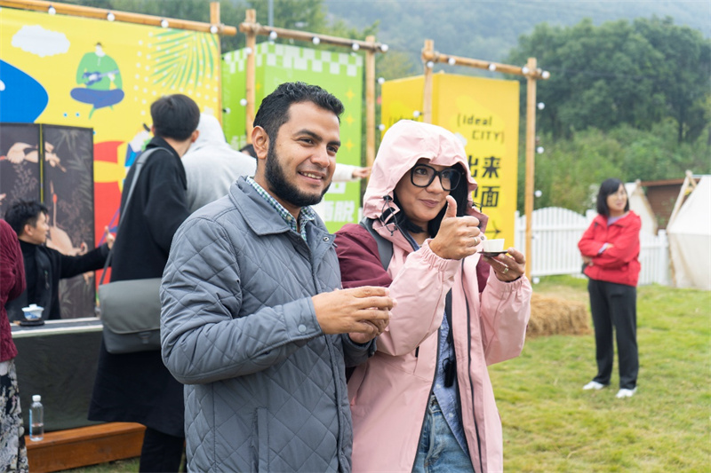 Jornalistas estrangeiros experimentam chá chinês na área cênica da Montanha Haishang Yuntai, em Lianyungang, província de Jiangsu, leste da China, em 22 de outubro de 2024. (Chang Sha, Diário do Povo Online)