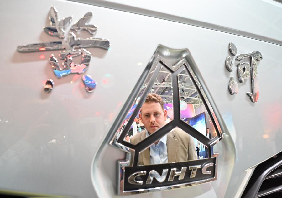 Um homem observa um trator movido a hidrogênio no estande da fabricante chinesa de caminh?es Sinotruk, no Transporte 2024 do Sal?o Internacional do Automóvel (IAA) em Hannover, Alemanha, em 17 de setembro de 2024. (Xinhua/Ren Pengfei)