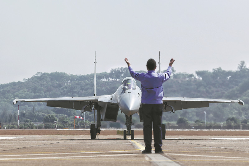 Um J-15T, uma nova variante do ca?a J-15, chega ao Aeroporto Jinwan em Zhuhai na província de Guangdong, na quarta-feira, fazendo sua estreia pública formal. [Foto: Tao Ran/China Daily]