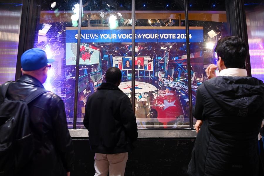 Pessoas assistem a uma transmiss?o ao vivo dos resultados da pesquisa de boca de urna para a elei??o presidencial dos EUA em 2024 na Times Square em Nova York, Estados Unidos, em 5 de novembro de 2024. (Foto: Li Rui/Xinhua)