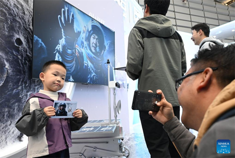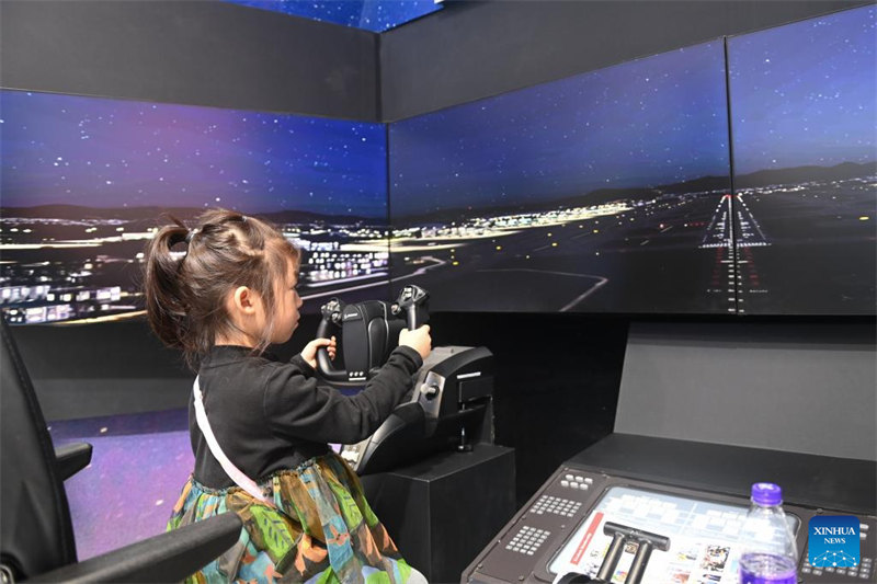 Uma crian?a experimenta um simulador de voo digital na Light of Internet Expo, em Wuzhen, província de Zhejiang, leste da China, em 19 de novembro de 2024. (Huang Zongzhi/Xinhua)