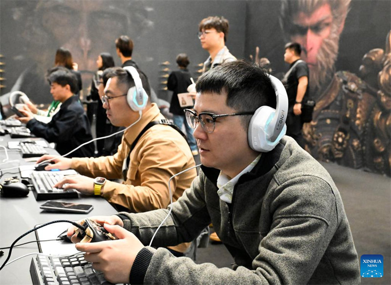 Visitantes experimentam o videogame "Black Myth: Wukong", na Light of Internet Expo, em Wuzhen, leste Província de Zhejiang, China, 19 de novembro de 2024. (Cai Xiangxin/Xinhua)