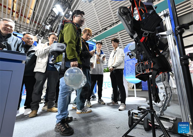 Um visitante experimenta um equipamento de exoesqueleto para levantamento de peso na Light of Internet Expo, em Wuzhen, província de Zhejiang, leste da China, em 19 de novembro de 2024. (Li He/Xinhua)
