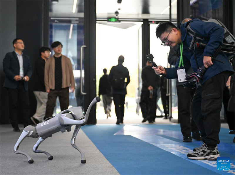 Um visitante interage com um c?o robótico inteligente na Light of Internet Expo, em Wuzhen, província de Zhejiang, leste da China, em 19 de novembro de 2024. (Cai Xiangxin/Xinhua)