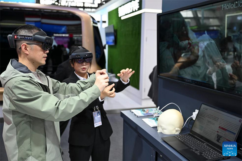 Um visitante experimenta um sistema holográfico de imagens médicas inteligentes sob a orienta??o de um membro da equipe na Light of Internet Expo, em Wuzhen, província de Zhejiang, leste da China, em 19 de novembro de 2024. (Cai Xiangxin/Xinhua)