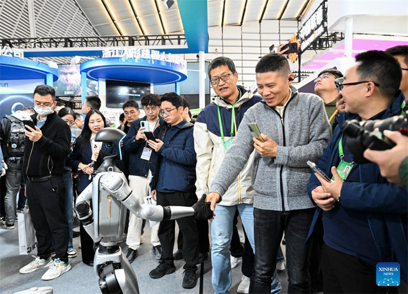 Um rob? humanoide (1o D) interage com visitantes na Light of Internet Expo, em Wuzhen, província de Zhejiang, leste da China, 19 de novembro de 2024. (Li He/Xinhua)