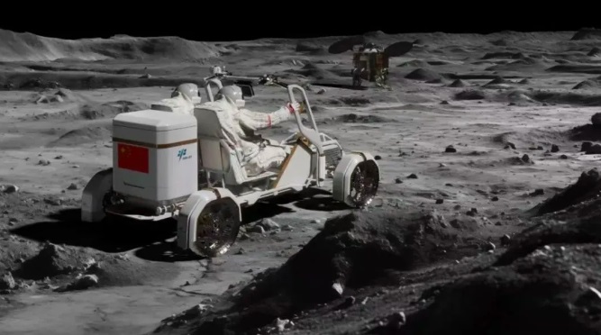 A anima??o no vídeo, divulgada pela Agência Espacial Tripulada da China (CMSA, sigla em inglês) no Simpósio Espacial Humano, demonstra astronautas dirigindo um veículo lunar na superfície da lua e exibe uma rota de três dias com a área de pouso no centro.
