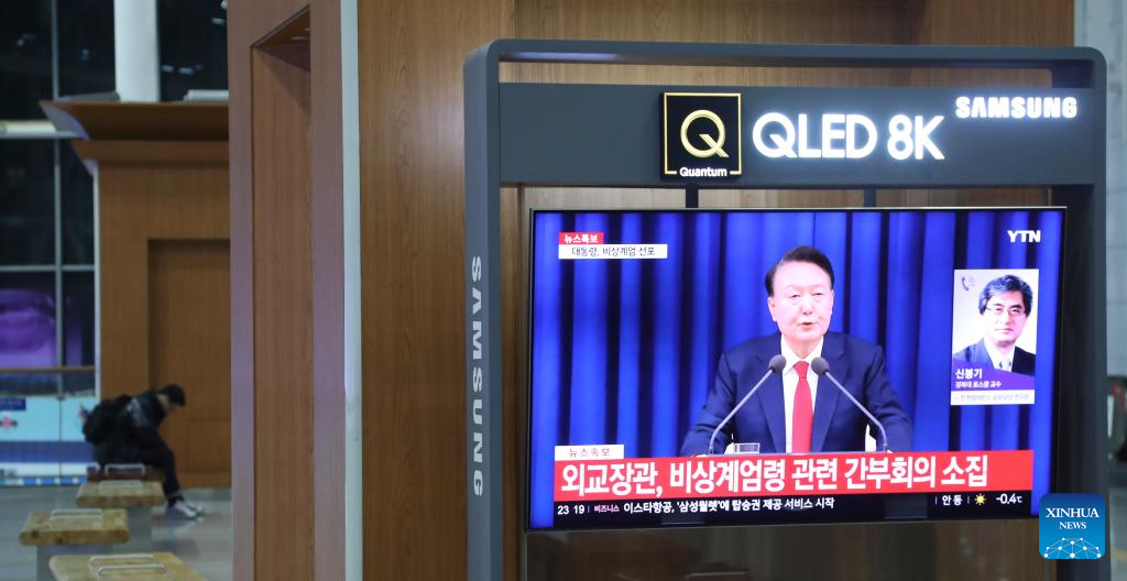 Esta??o de Seul, Coreia do Sul em 3 de dezembro de 2024, com uma tela exibindo o presidente sul-coreano, Yoon Suk-yeol, declarando uma lei marcial de emergência em um discurso televisionado. (Yao Qilin/Xinhua)