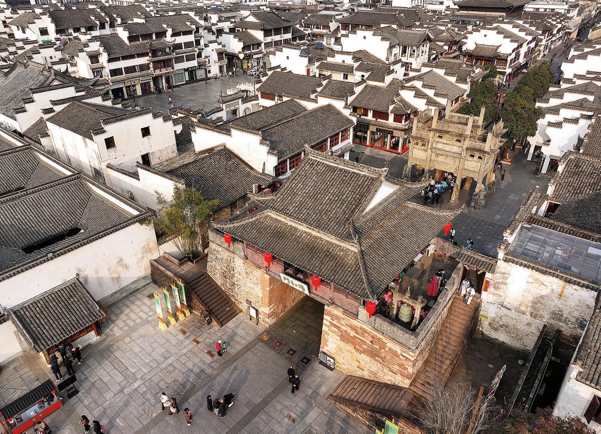 A Cidade Antiga de Huizhou em Shexian, província de Anhui, atrai turistas para vivenciar a arquitetura, o estilo de vida popular e a cultura de Huizhou. (Foto: Shi Yalei/China Daily)