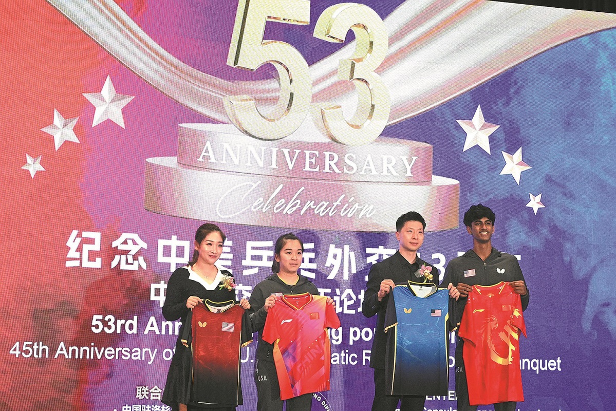 Durante o evento, os campe?es mundiais de tênis de mesa chineses Ma Long e Liu Shiwen, juntamente com jogadores de tênis de mesa dos EUA, compareceram a uma cerim?nia de troca de camisas.