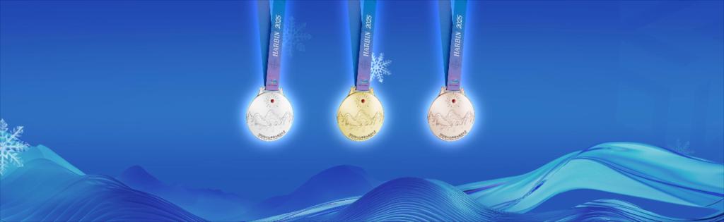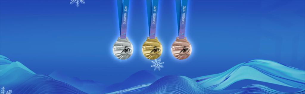 O design das medalhas dos Jogos, intitulado "Espírito da Velocidade", combina a forma aerodinamica de uma pista de corrida com o emblema dos Jogos na face frontal, capturando o movimento poderoso e gracioso dos atletas em a??o. As curvas fluídas da pista incorporam a silhueta do Grande Teatro de Harbin, refletindo a estética única da cidade.
