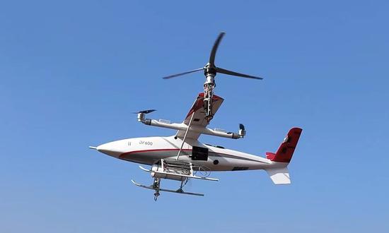 Uma aeronave eVTOL n?o tripulada movida a hidrogênio líquido de nível de tonelada conclui seu voo de teste na cidade de Baoji, província de Shaanxi, noroeste da China. (Foto: Cortesia da Shaanxi Tongchen Heguang Cryogenic Technology Co Ltd.)