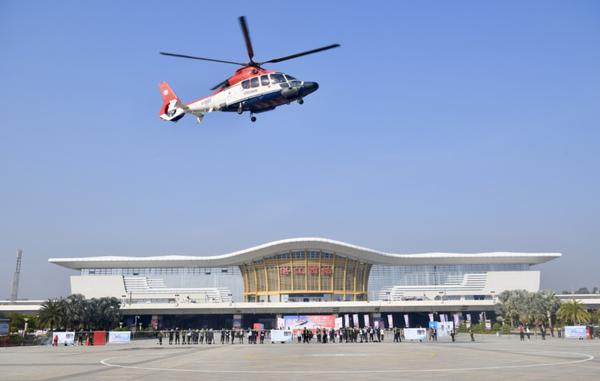 A primeira viagem de helicóptero sobre o Estreito de Qiongzhou estreou na segunda-feira, conectando esta??es ferroviárias em Zhanjiang, província de Guangdong, e Haikou, província de Hainan. (Foto: Lang Shuchen/China Daily)