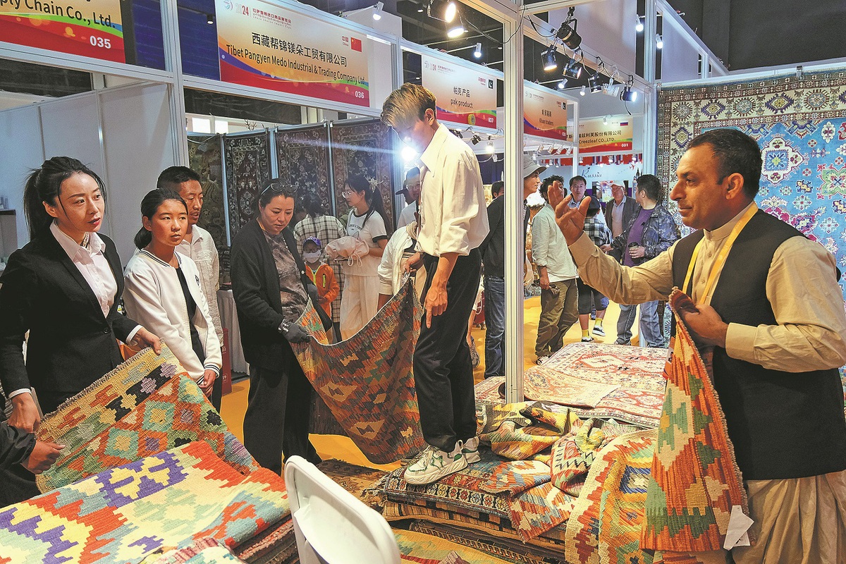 Um expositor afeg?o (à direita) apresenta tapetes aos clientes na Exposi??o de Importa??o de Lhasa no Centro de Exposi??es Xizang em Lhasa, Regi?o Aut?noma de Xizang, em 4 de agosto. O evento atraiu mais de 200 empresas e mais de 600 comerciantes estrangeiros de 31 países e regi?es. (Foto: Jiang Feibo/China News Service)
