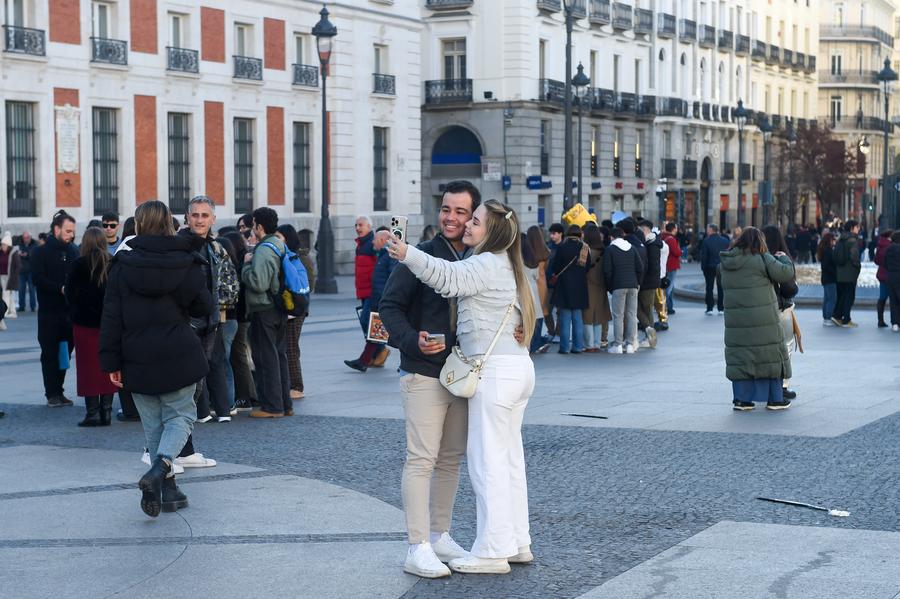 Turistas tiram selfies em Madri, Espanha, em 15 de janeiro de 2025. (Foto: Gustavo Valiente/Xinhua)