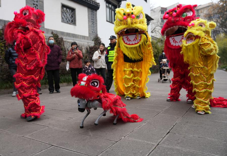 Um c?o rob? e atores realizam a dan?a do le?o durante uma feira de templo celebrando o Festival das Lanternas no distrito de Xihu em Hangzhou, província de Zhejiang, leste da China, em 11 de fevereiro de 2025. (Foto: Han Chuanhao/Xinhua)