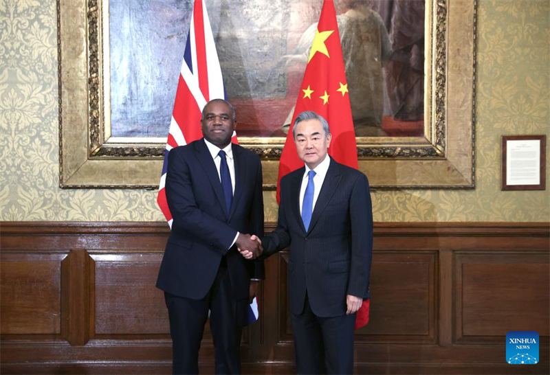 O Ministro das Rela??es Exteriores da China, Wang Yi, também membro do Bureau Político do Comitê Central do Partido Comunista da China, cumprimenta o Secretário de Rela??es Exteriores britanico, David Lammy, em Londres, a 13 de fevereiro de 2025. Wang co-presidiu o 10o Diálogo Estratégico China-Reino Unido com Lammy na quinta-feira. (Foto: Li Ying/Xinhua)