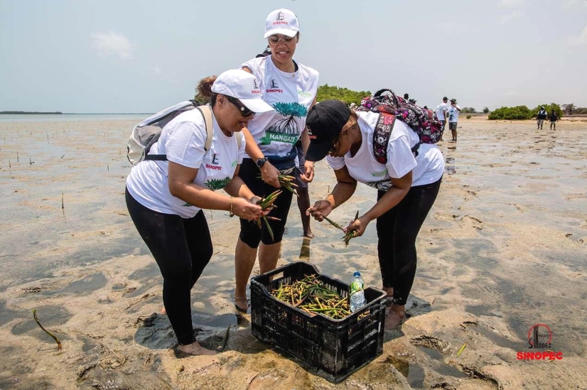 Funcionários da filial angolana da Sinopec International Petroleum Exploration and Production Corporation (SIPC) plantam mudas de manguezal em uma praia. (Foto: Zhao Xuchi)