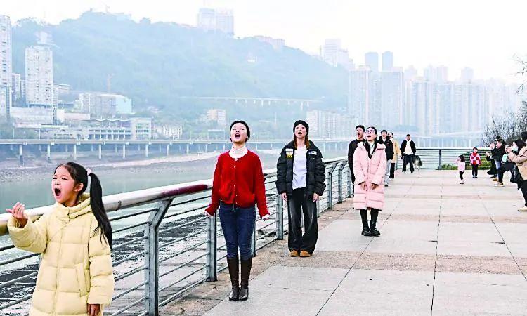No mirante do Parque Binjiang, no distrito de Jiangbei, em Chongqing, turistas se alinham junto à grade de prote??o e posam com o trem que atravessa o prédio ao fundo, capturando fotos criativas como se estivessem "engolindo o trem" ou "empurrando o monotrilho", dando um toque divertido à paisagem urbana da cidade.