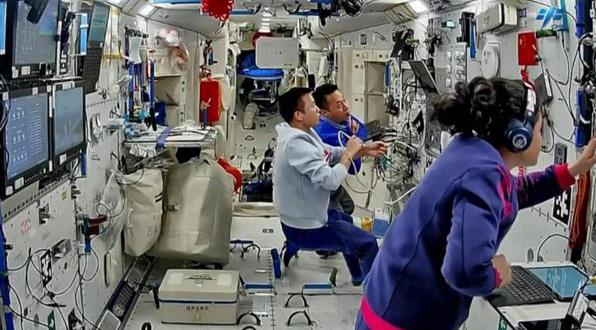 Os membros da tripula??o da miss?o Shenzhou XIX trabalham na esta??o espacial da China. (Foto/CMG)