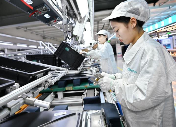 Funcionários trabalhando na linha de montagem de TV da Hisense em Qingdao, província de Shandong. (Foto: Li Ziheng/Xinhua)