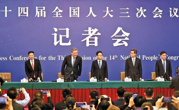 Altos funcionários participam de uma coletiva de imprensa sobre a economia da China na terceira sess?o da 14a Assembleia Popular Nacional (APN) em Beijing na quinta-feira. (Foto: Zhang Wei/China Daily)