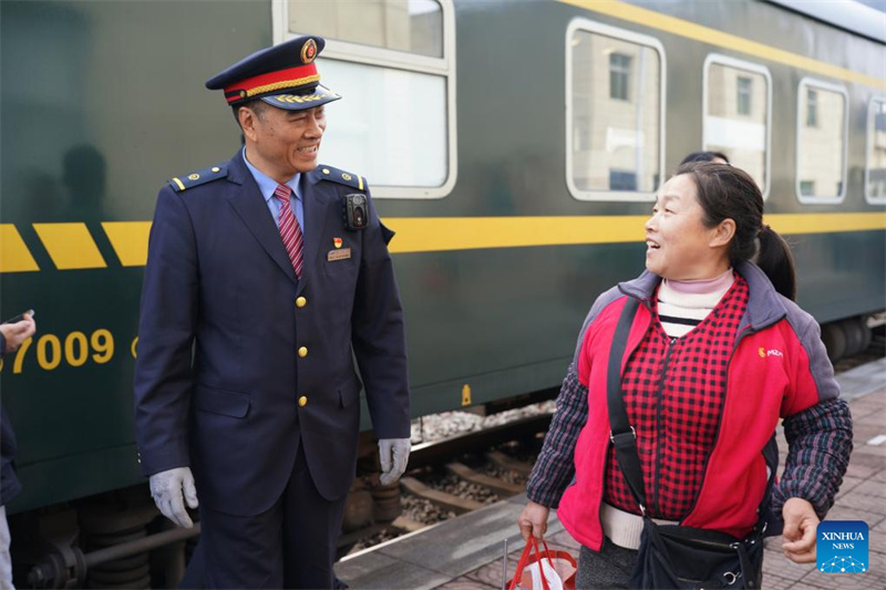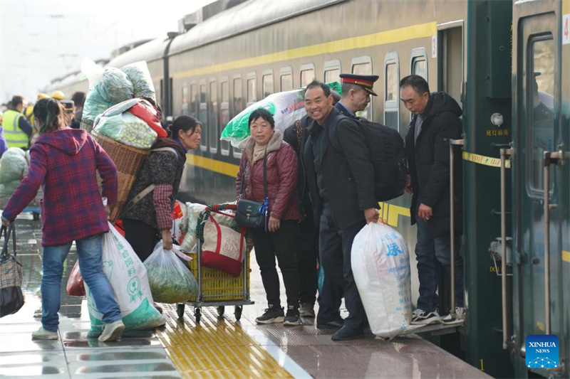 Passageiros entram e saem do trem no 6064 na esta??o Yangpingguan em Hanzhong, província de Shaanxi, noroeste da China, em 17 de fevereiro de 2025. (Foto: Shao Rui/ Xinhua)
