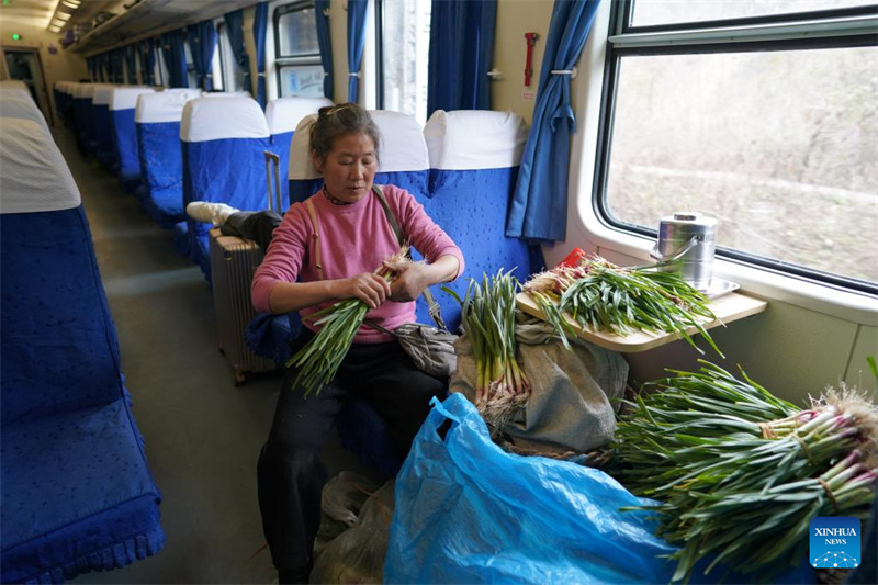 Com quase 70 anos, Jiang Minglin utiliza o trem há décadas, transportando até 30kg de vegetais frescos a bordo a cada dois dias para vender no condado vizinho.
