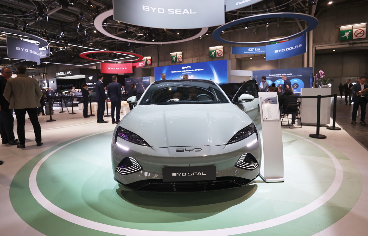 Um veículo BYD em exposi??o durante uma exposi??o automotiva em Paris, Fran?a, no ano passado. (Foto: Gao Jing/Xinhua)