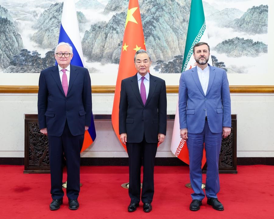 O ministro das Rela??es Exteriores chinês, Wang Yi, também membro do Bir? Político do Comitê Central do Partido Comunista da China, se reúne com o vice-ministro das Rela??es Exteriores russo, Ryabkov Sergey Alexeevich, e o vice-ministro das Rela??es Exteriores iraniano, Kazem Gharibabadi, em Beijing, capital da China, em 14 de mar?o de 2025. (Xinhua/Liu Bin)
