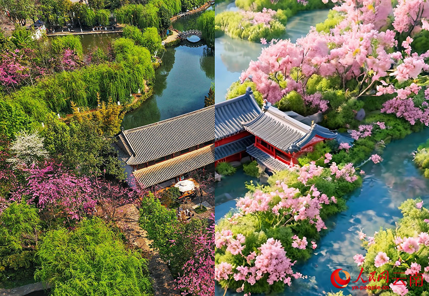Fotos reais × IA desbloqueia a maneira estética de abrir as flores de cerejeira da primavera no Jardim Botanico Fengzeyuan em Kunming, a 19 de mar?o de 2025. (Foto combinada: Wang Ruiyu/Diário do Povo Online)