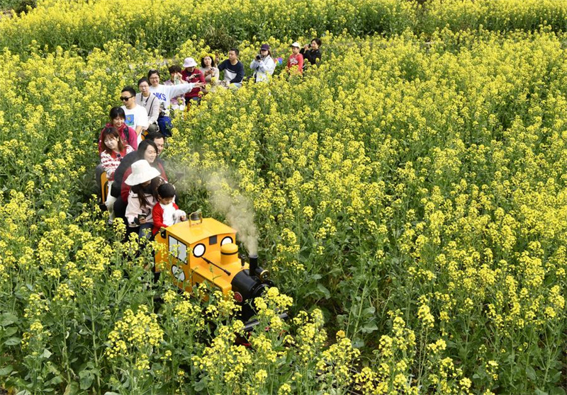 Turistas apreciam flores de cole desabrochando num trem turístico no ponto turístico de Jiangling, no condado de Wuyuan, cidade de Shangrao, província de Jiangxi, leste da China, em 23 de mar?o de 2025. (Foto: Li Zongxian/Xinhua)