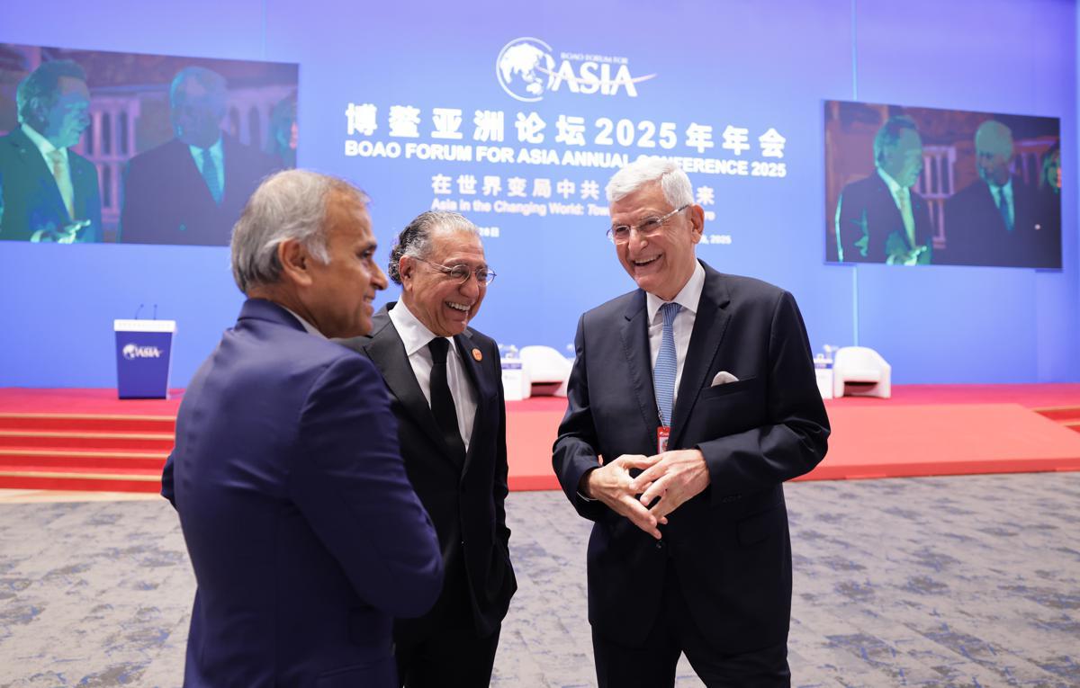 O coordenador residente das Na??es Unidas na China, Siddharth Chatterjee (à esquerda), Munir Akram (ao centro), representante permanente do Paquist?o na ONU, e Volkan Bozkir, presidente da 75a sess?o da Assembleia Geral da ONU, conversam na quarta-feira antes de um diálogo de alto nível na Conferência Anual do Fórum Boao para a ásia de 2025 em Boao, província de Hainan. (Foto: Feng Yongbin /China Daily)