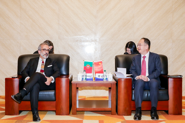 Paulo Rangel, ministro de Estado e dos Negócios Estrangeiros de Portugal, visita a Universidade de Estudos Estrangeiros de Beijing e reúne-se com o reitor da Universidade de Estudos Estrangeiros de Beijing, Jia Wenjian, em 25 de mar?o. (Foto: Universidade de Estudos Estrangeiros de Beijing)
