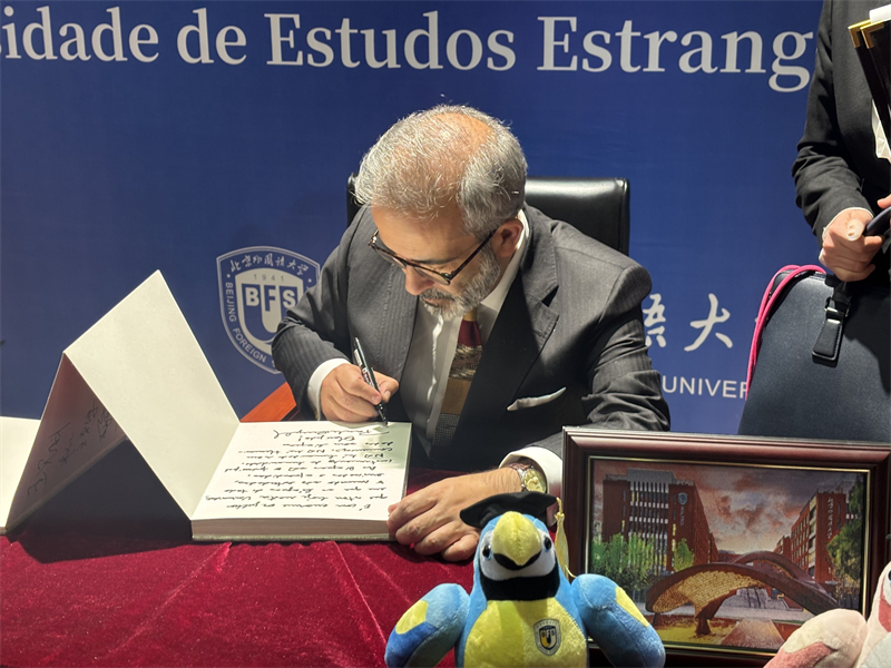Paulo Rangel, ministro de Estado e dos Negócios Estrangeiros de Portugal, visita a Universidade de Estudos Estrangeiros de Beijing e deixa uma mensagem escrita para os estudantes, em 25 de mar?o. (Foto: Zhang Rong/Diário do Povo Online)
