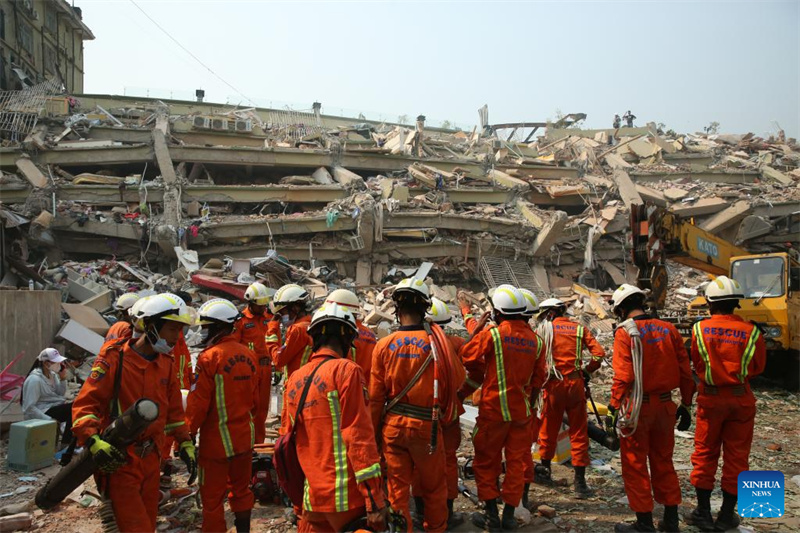 Equipes de resgate se preparam para realizar opera??es de busca e resgate após um terremoto em Mandalay, Mianmar, em 30 de mar?o de 2025. Cerca de 1.700 pessoas morreram, 3.400 ficaram feridas e 300 continuam desaparecidas no grande terremoto em Mianmar, de acordo com o Conselho de Administra??o Estatal do país no domingo. (Foto: Myo Kyaw Soe/Xinhua)