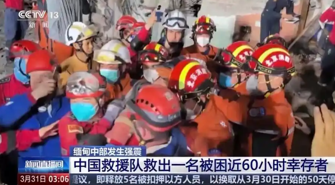 às 5h37 do mesmo dia, após esfor?os contínuos, a equipe de resgate chinesa conseguiu resgatar uma crian?a que estava soterrada há mais de 60 horas nos escombros do condomínio Sky Apartment, também em Mandalay.