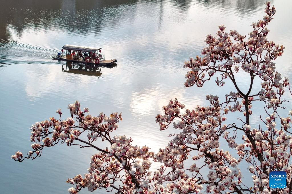 Pessoas passeando de barco no Rio Xin'an, no condado de Shexian, cidade de Huangshan, na província de Anhui, no leste da China, em 6 de mar?o de 2025. (Foto: Xinhua)
